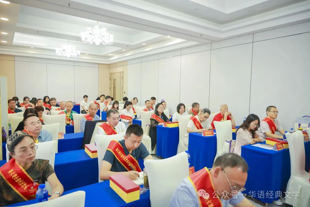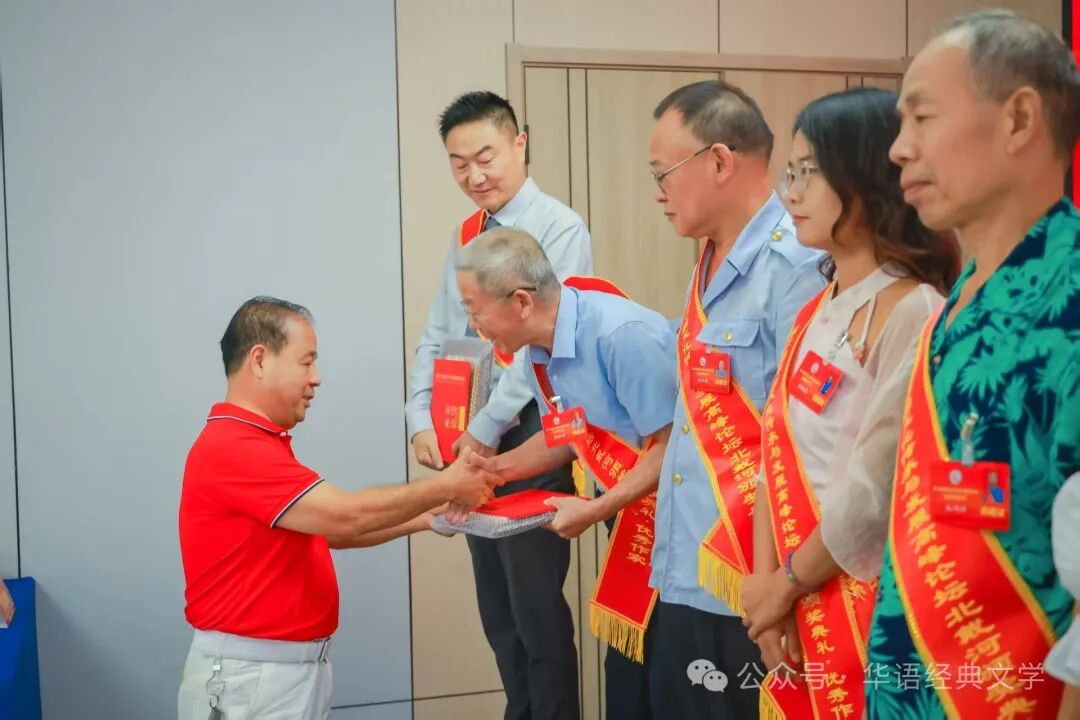 颁奖典礼现场气氛欢快而热烈,嘉宾云集。在优美的颁奖典礼音乐声中,荣获一二三等奖的作者走向领奖台,与会领导专家一一为他们颁发了奖牌和证书,与会领导专家先后致辞,祝贺大会召开,祝贺各位获奖作家,对他们的创作成就给予了高度肯定。获奖作家代表、灌南文学责编、江苏省百名优秀退役军人服务站站长高平海发表感言,他在发言中分享了自己的创作心得与体会,表达了对大赛的感谢以及对文学创作的热爱与执着:首先,请允许我向大会组委会致以最诚挚的谢意。是你们以远见卓识搭建起这座横跨古今的文学“山海之桥”,让我们得以在个体经验与集体记忆的交汇处促膝对话,在传统文脉与时代浪潮的激荡中探寻创作的突围之路。也感谢每一位评委老师的精准目光,这份肯定如灯塔穿透迷雾,让我们更加确信:文学的星光,永远为真诚的书写者亮着;时代的沃土,永远为扎根生活的文字结出硕果。